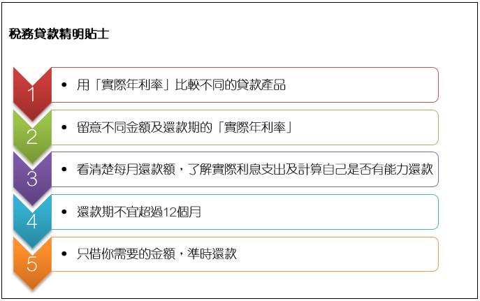 此外,消費者還要看清楚每月還款額,了解實際利息支出及計算自己是否有能力還款。一般而言,稅務貸款還款年期不宜超過12個月,因為下一年的這個時候你又需要繳交下一年的稅款。