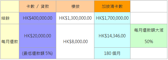 何先生現職為銷售員, 每月收入$29,000, 總欠債達40萬, 自己擁有一層280萬物業。曾想以物業加按清還卡數,但因信貸紀錄不良,大部份銀行都不接納其申請。