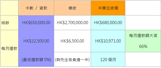趙小姐現職為美容師, 每月收入$30,000, 總欠債達65萬, 自己與先生擁有一層600萬聯名物業。由於不想先生擔心, 所以並沒有向先生披露欠債情況, 以致債台高築。