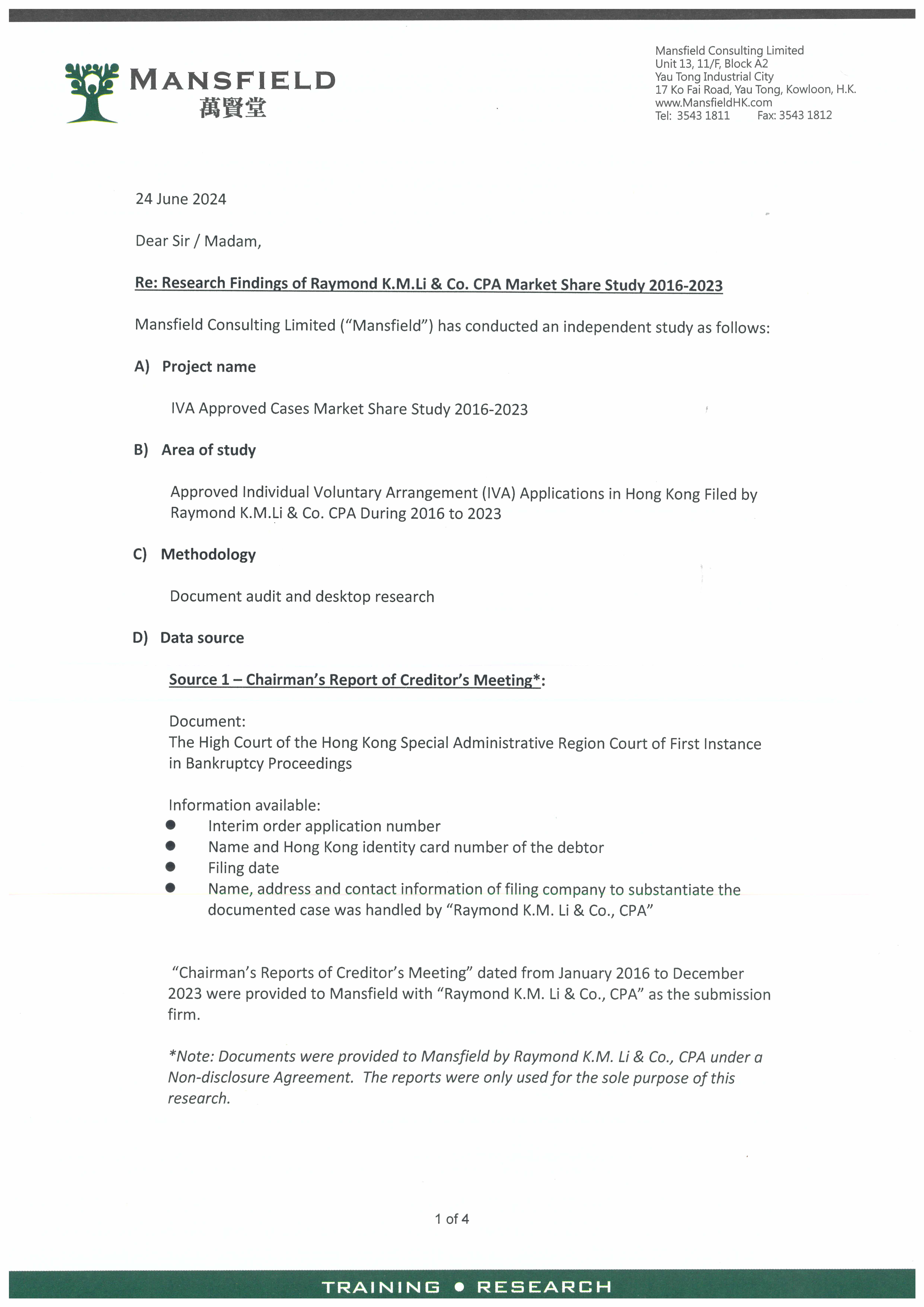 李建民執業會計師事務所專注於債務重組服務十多年,成功為全港數千人解決債務問題,幫助數千家庭重過新生活。我們的專業、專注和誠信取得客戶及業界一致的高度認可,本所一向秉持中肯、以客為中心、收費公道和透明的原則,贏得客戶的信任和口碑。憑藉實力和佳績,本所於2024年6月24日榮獲專業獨立第三方市場調查公司 "Mansfield Consulting Ltd"核實和認證本所於2016至2023年期間,每年處理全港超過一半(>50%)以上的債務重組成功批核個案。債務重組市場佔有率連續8年全港第一*,成為全港最多人選用之債務重組事務所*。